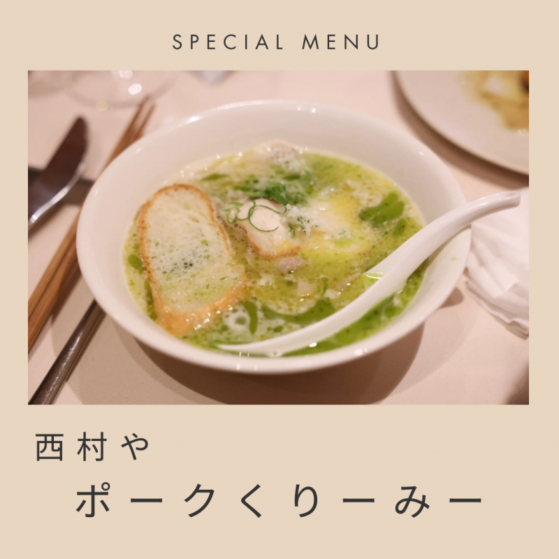 西村やのポークくりーみーは、西村流とんこつ、和風出汁、肉と香味野菜からとるブイヨン、チーズをブレンドし。もち小麦を使用したオリジナル麺が美食家をうならせる一品。