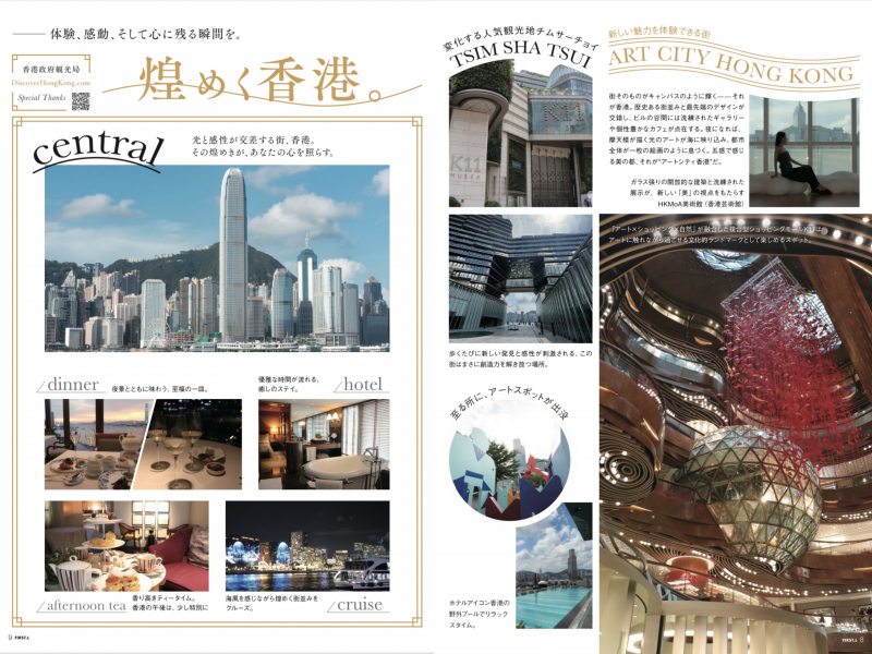 巻頭ページは、「煌めく香港」をテーマに、アートスポット、ラグジュアリーホテル、ナイトスポットなど12ページにわたりご紹介しています。