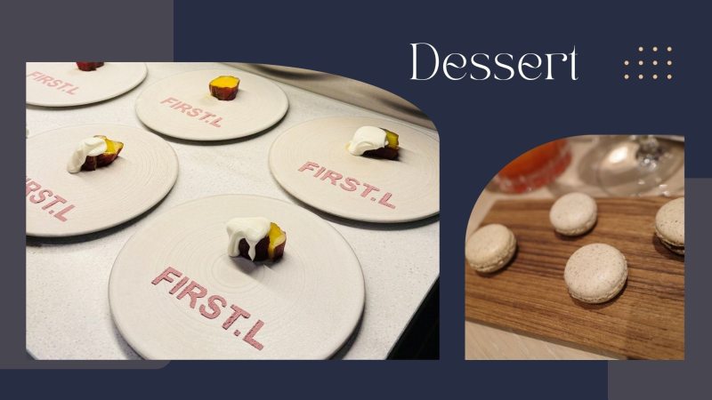 FIRST.Lのロゴをあしらったデザートは、福岡県産のマスカルポーネと甘太くんの焼き芋に焼き菓子。